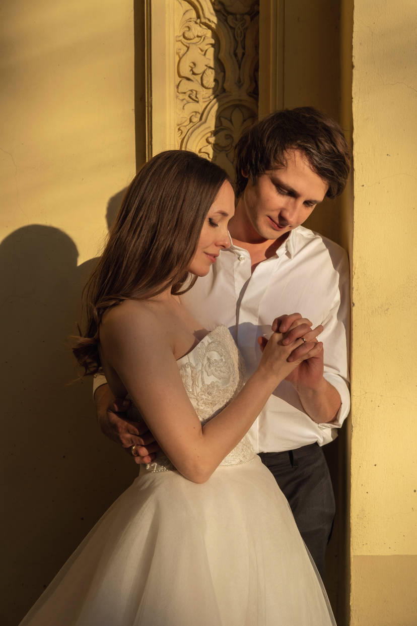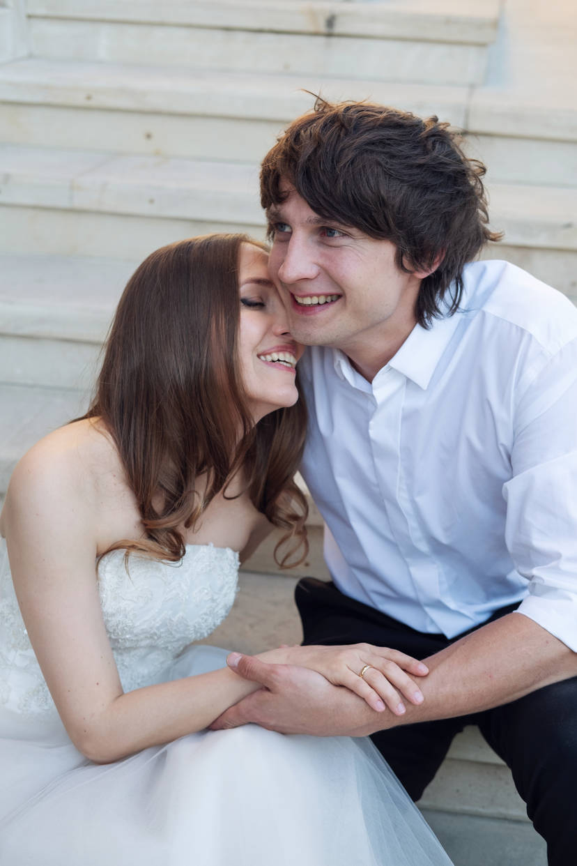 Невеста поправляет платье. Жених чуть улыбается.